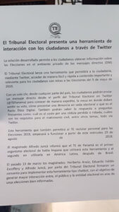«Desde cualquier parte del país, los ciudadanos podrán enviar un mensaje directo desde el perfil del Tribunal Electoral en Twitter (@TEPanama) para conocer de manera expedita, la mesa en donde deben emitir su voto, cómo presentar una denuncia en veda electoral o qué es el Pacto Ético Digital», se precisa en el comunicado.